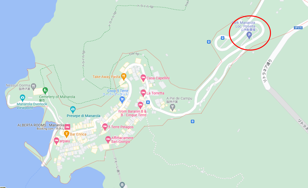 まずはマナローラ駅に向かう、といこうと思ったのですが、ここで、気になっていたことを調査しなくては、という気持ちが芽生えてきます。そう、今回私は列車でここにやってきたわけですが、もし皆様が車でここマナローラを訪れたいと思った場合はどうすればいいか。この街ではほぼ走っている一般車両を見ていません。そもそも車が易々と入ってこれるような広い道でもありません。けど、皆様方のなかには、車でご旅行され、このマナローラに宿泊される方もいらっしゃるかもしれません。そういった方にとっては、駐車場はどうすればいいのか、をまずは確認してくることにしました。